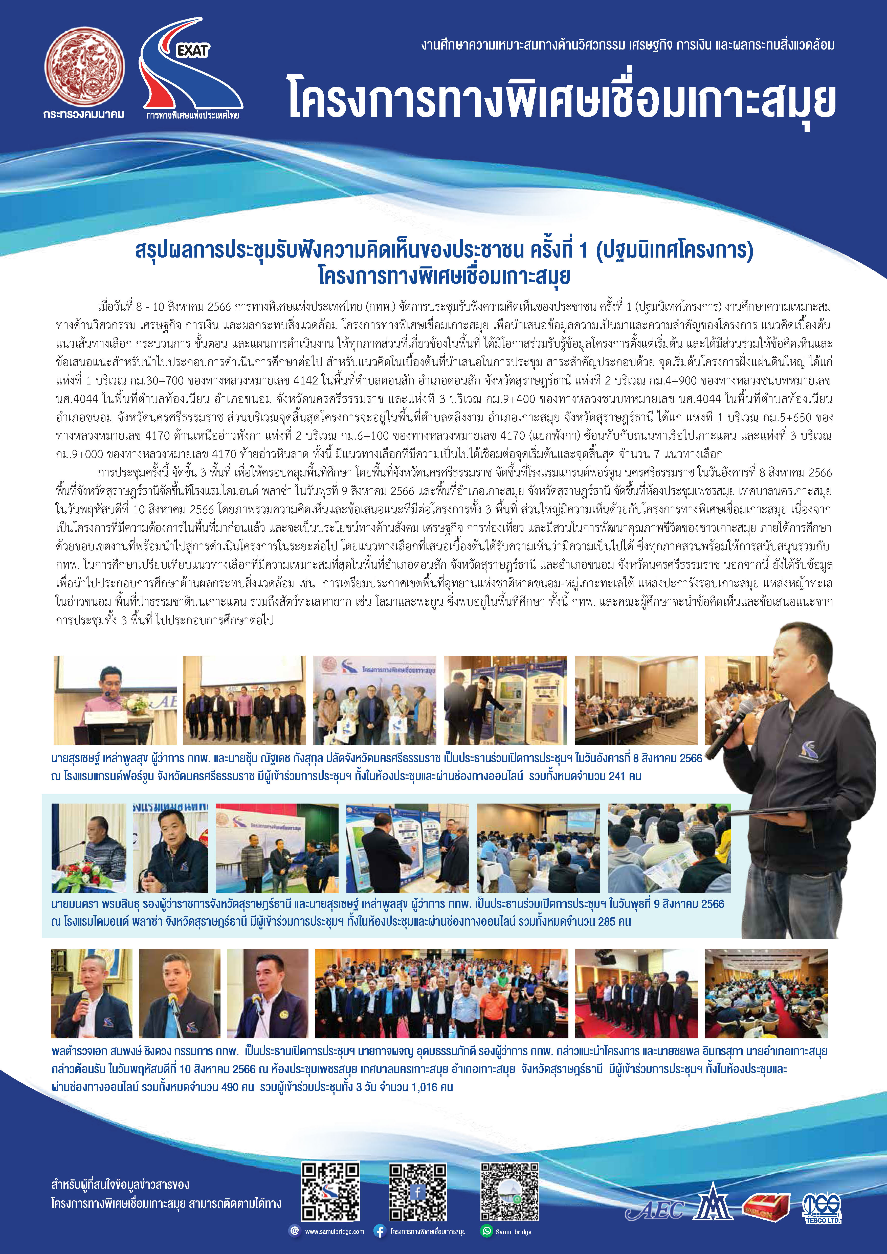 การประชุมรับฟังความคิดเห็นของประชาชน ครั้งที่ 1 (ปฐมนิเทศโครงการ) งานศึกษาความเหมาะสมทางด้านวิศวกรรม เศรษฐกิจ การเงิน และผลกระทบสิ่งแวดล้อม โครงการทางพิเศษเชื่อมเกาะสมุย เมื่อวันอังคารที่ 8 สิงหาคม 2566 เวลา 08.30-12.30 น. ณ ห้องประชุม Fortune 2 โรงแรมแกรนด์ ฟอร์จูน นครศรีธรรมราช อำเภอเมือง จังหวัดนครศรีธรรมราช