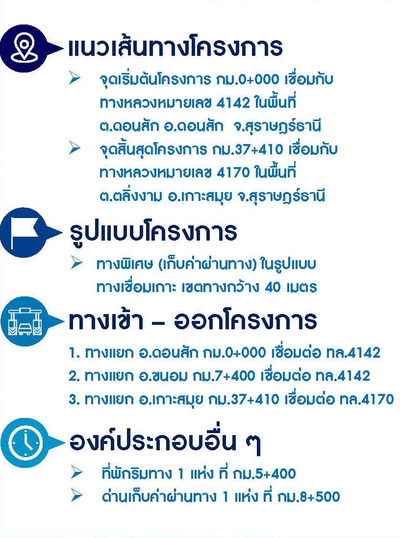 โดยครอบคลุมการดำเนินกิจกรรมการประชุมในพื้นที่จังหวัดนครศรีธรรมราช ประกอบด้วย ตำบลควนทอง และตำบลท้องเนียน อำเภอขอม และจังหวัดสุราษฎร์ธานี ประกอบด้วย ตำบลดอนสัก อำเภอดอนสัก และตำบลตลิ่งงาม อำเภอเกาะสมุยทั้งนี้ หากมีความสนใจติดตามข้อมูลข่าวสารโครงการ สามารถติดตามได้ที่ Line Official : Samui bridge หรือ Facbook : โครงการทางพิเศษเชื่อมเกาะสมุย