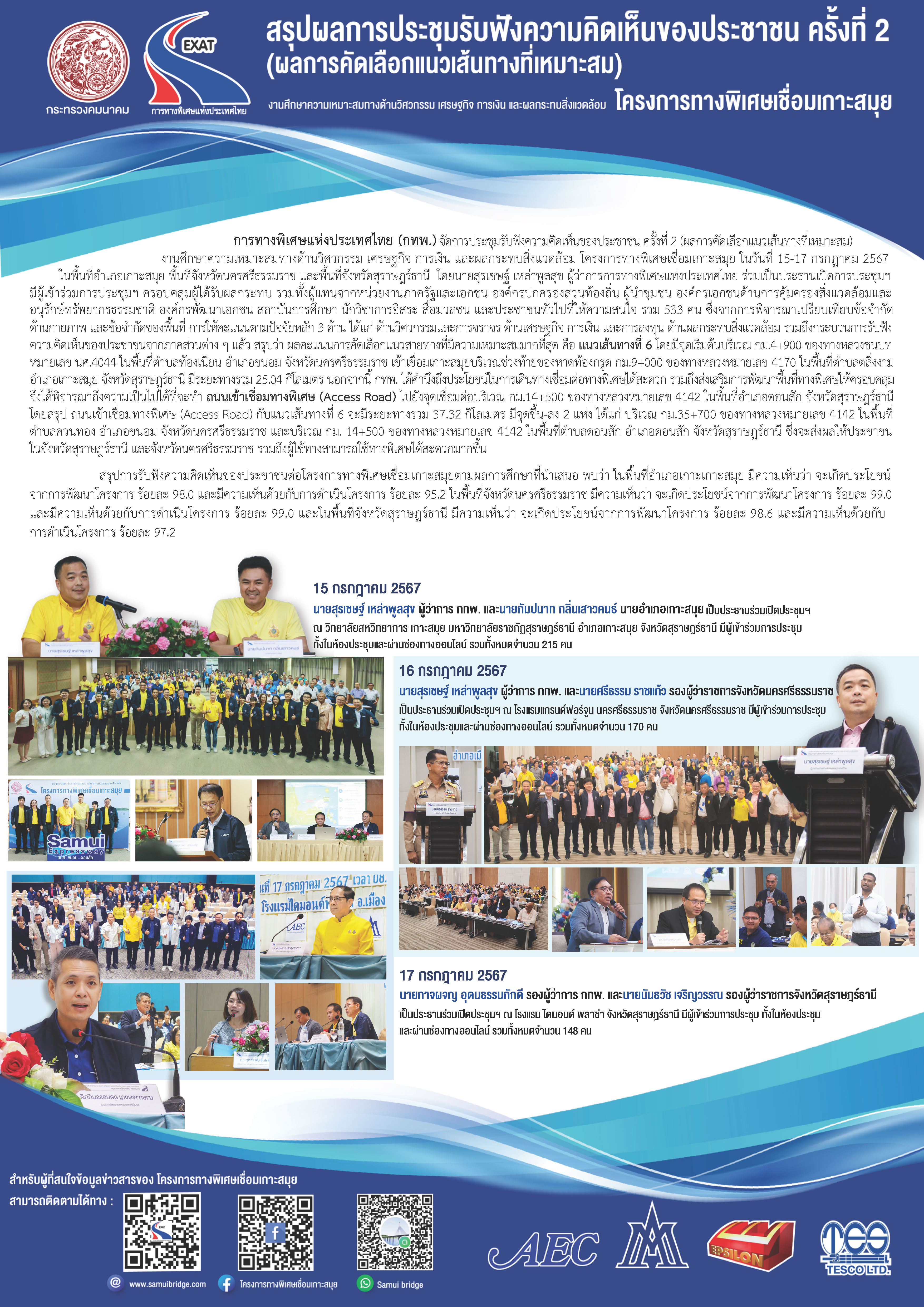 การทางพิเศษแห่งประเทศไทย (กทพ.) กระทรวงคมนาคม จัดการประชุมรับฟังความคิดเห็นของประชาชน ครั้งที่ 2 (ผลการคัดเลือกแนวเส้นทางที่เหมาะสม) งานศึกษาความเหมาะสมทางด้านวิศวกรรม เศรษฐกิจ การเงิน และผลกระทบสิ่งแวดล้อม โครงการทางพิเศษเชื่อมเกาะสมุย เมื่อวันจันทร์ที่ 15 กรกฎาคม 2567 เวลา 08.30-12.30 น. ณ ห้องประชุมเฉวง ชั้น 3 วิทยาลัยสหวิทยาการ เกาะสมุย มหาวิทยาลัยราชภัฏสุราษฎร์ธานี พื้นที่อำเภอเกาะสมุย จังหวัดสุราษฎร์ธานี โดยมี นายสุรเชษฐ์ เหล่าพูลสุข ผู้ว่าการการทางพิเศษแห่งประเทศไทย และ นายกัมปนาท กลิ่นเสาวคนธ์ นายอำเภอเกาะสมุย ร่วมเป็นประธานเปิดการประชุมฯ