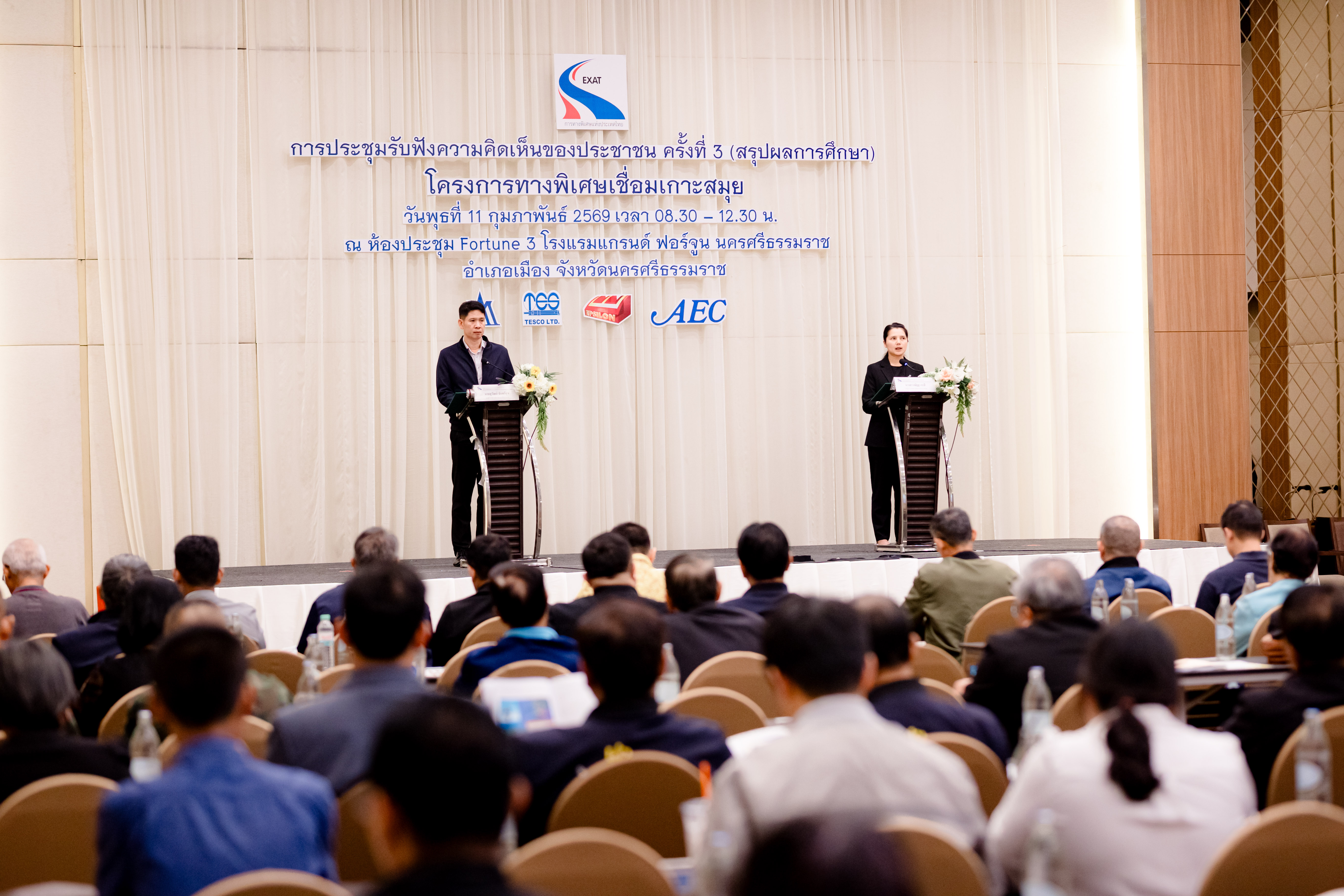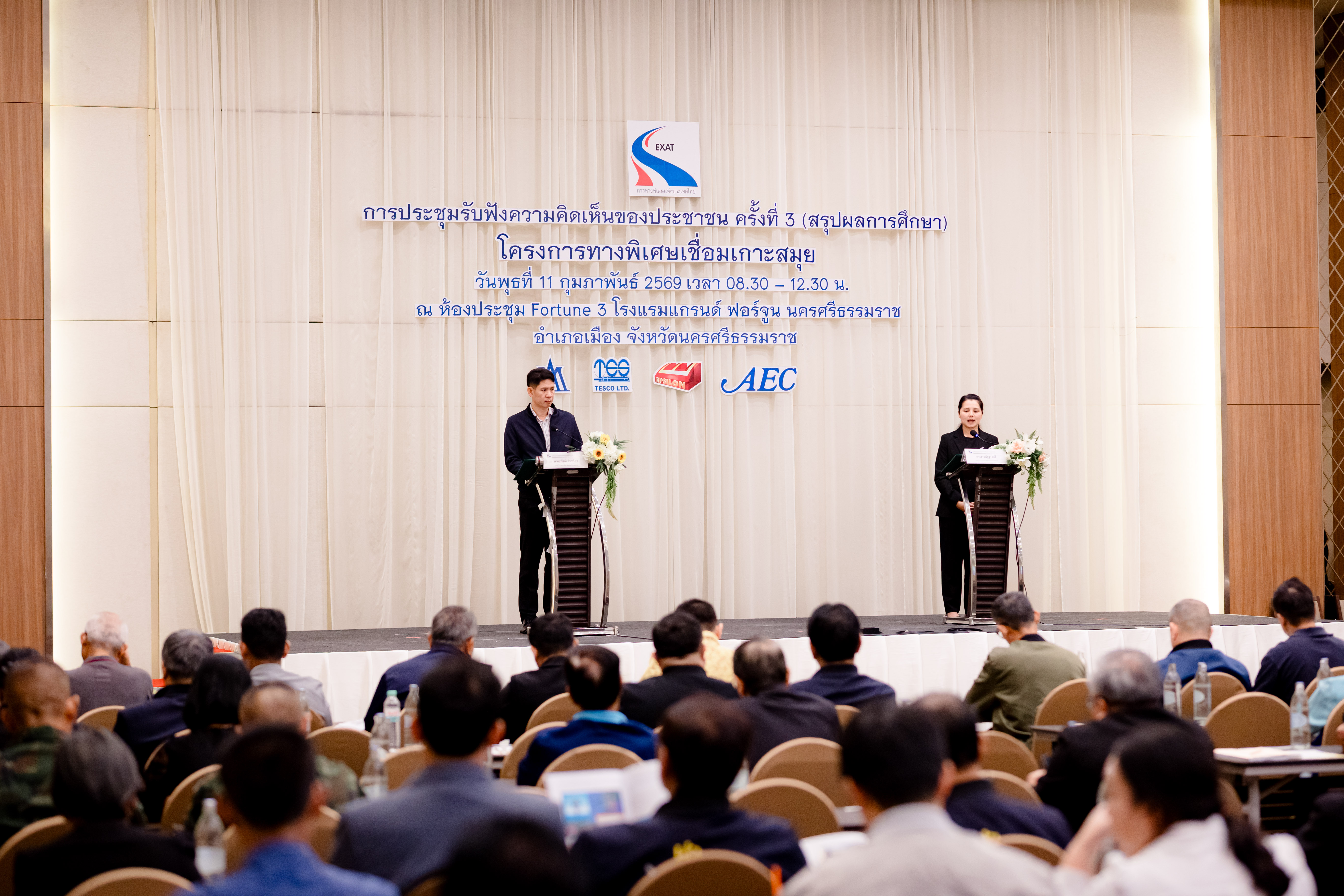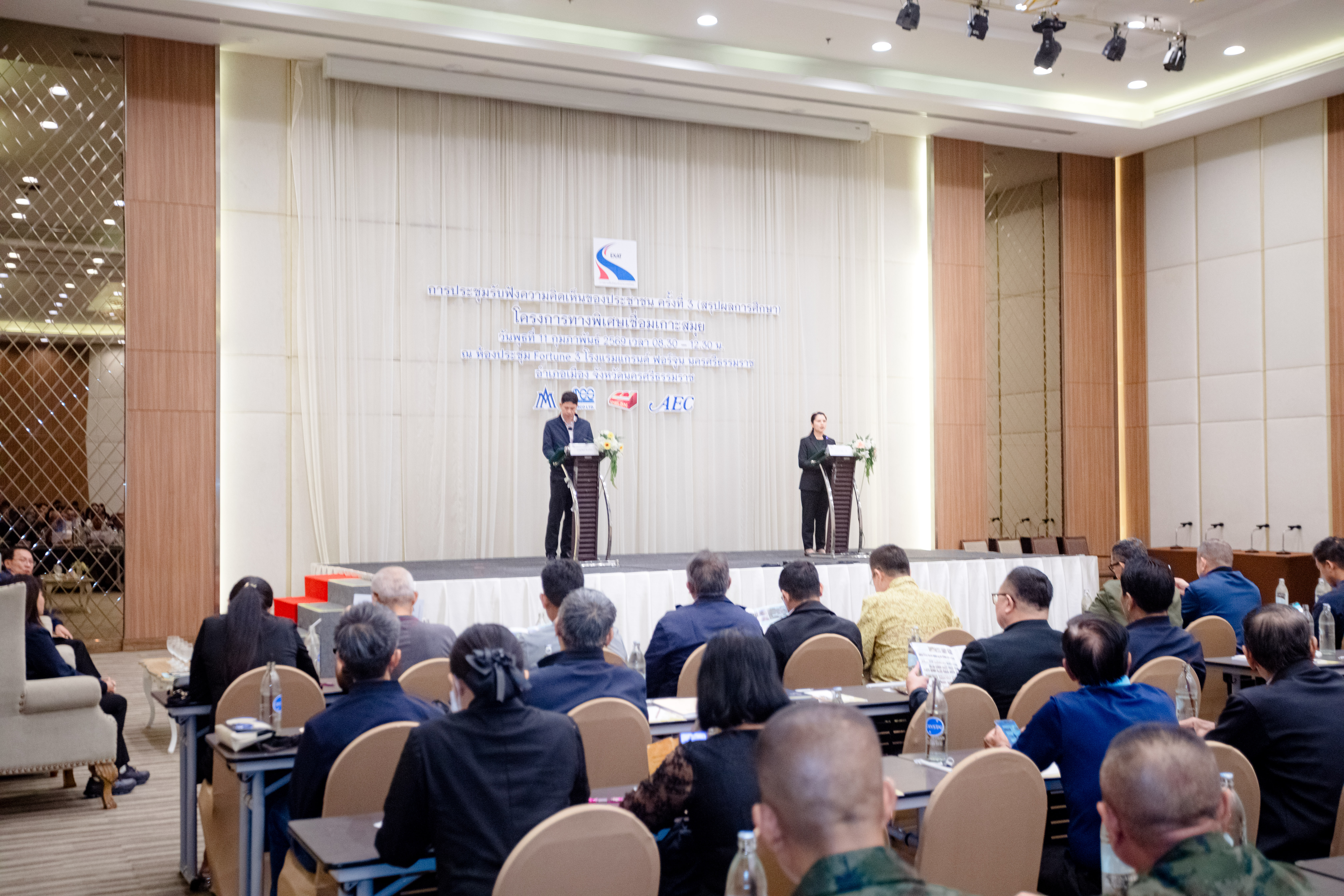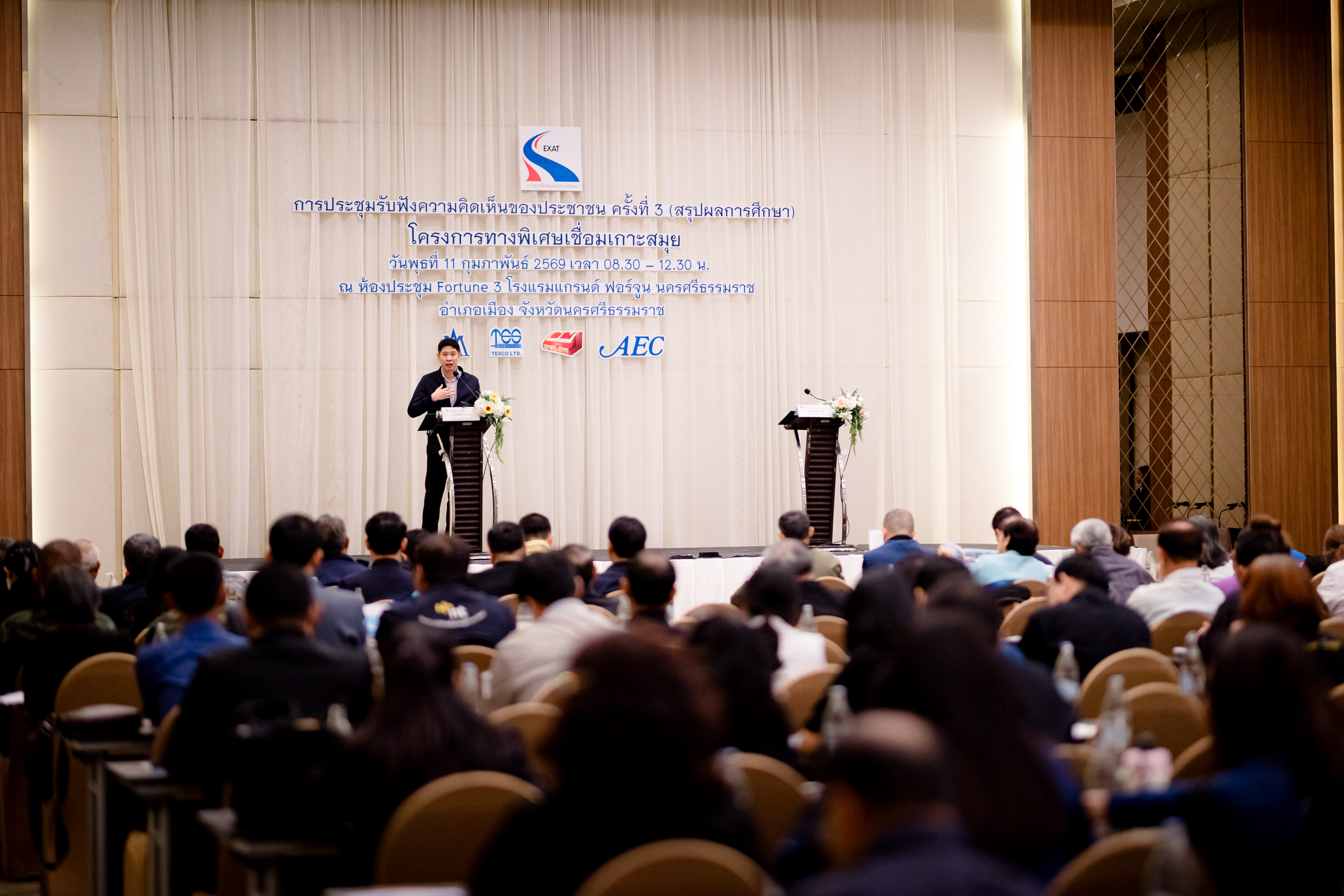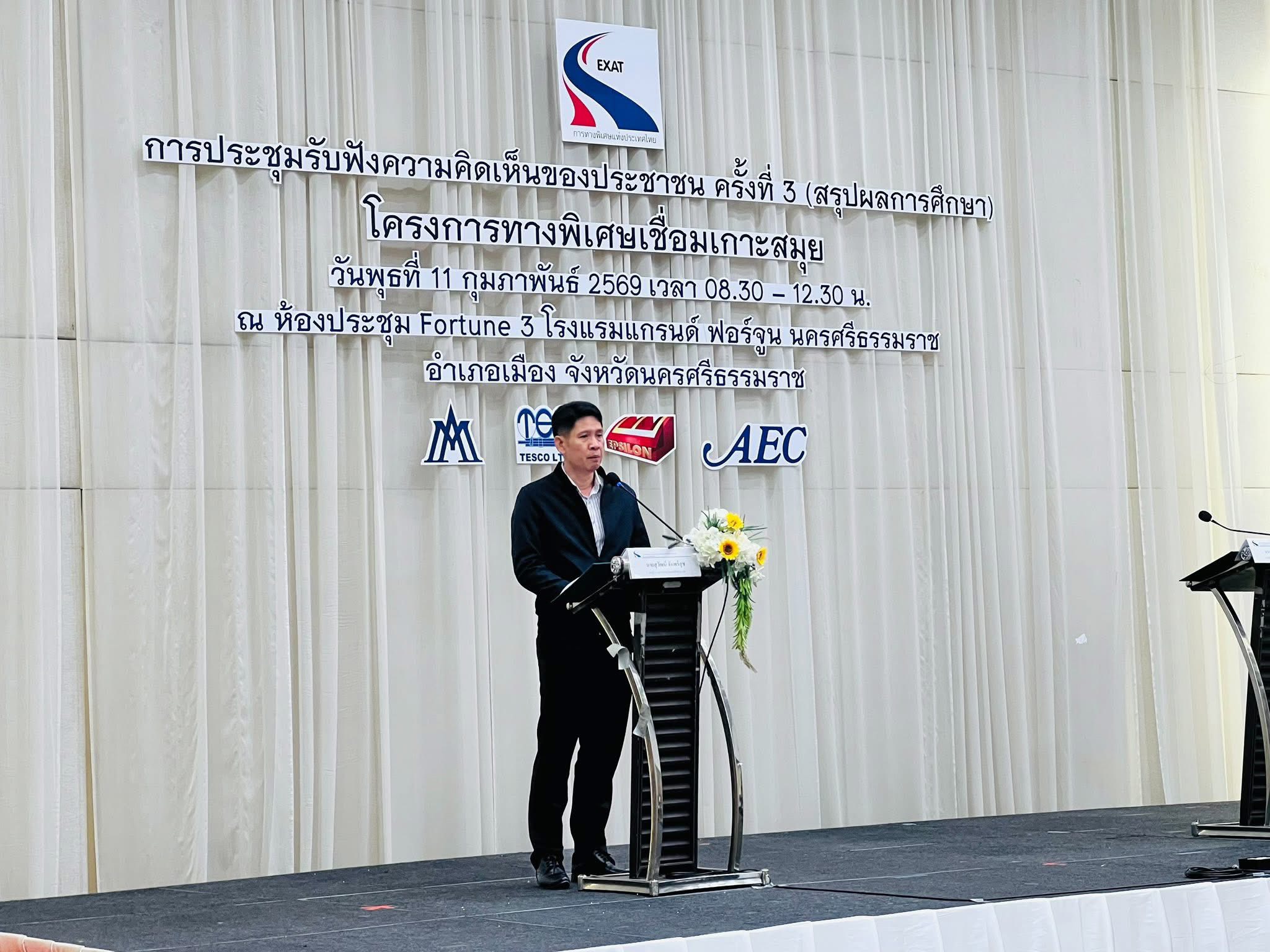 การทางพิเศษแห่งประเทศไทย (กทพ.) กระทรวงคมนาคม จัดการประชุมรับฟังความคิดเห็นของประชาชน ครั้งที่ 3 (สรุปผลการศึกษา) งานศึกษาความเหมาะสมทางด้านวิศวกรรม เศรษฐกิจ การเงิน และผลกระทบสิ่งแวดล้อม โครงการทางพิเศษเชื่อมเกาะสมุย พื้นที่จังหวัดนครศรีธรรมราช เมื่อวันพุธที่ 11 กุมภาพันธ์ 2569 เวลา 08.30-12.30 น. ณ ห้องประชุม Fortune 3 โรงแรมแกรนด์ ฟอร์จูน นครศรีธรรมราช อำเภอเมือง จังหวัดนครศรีธรรมราช โดยมี นางสาวณัฐฐา กาสี รองผู้ว่าการ (การเงิน บัญชี และพัฒนาธุรกิจ) การทางพิเศษแห่งประเทศไทย และ นายสุวัฒน์ จันทร์สุข รองผู้ว่าราชการจังหวัดนครศรีธรรมราช ร่วมเป็นประธานเปิดการประชุมฯ มีผู้เข้าร่วมการประชุมฯ จากหน่วยงานภาครัฐและเอกชน องค์กรปกครองส่วนท้องถิ่น ผู้นำชุมชน องค์กรเอกชน ด้านการคุ้มครองสิ่งแวดล้อมและอนุรักษ์ทรัพยากรธรรมชาติ ครอบคลุมผู้ได้รับผลกระทบ องค์กรพัฒนาเอกชน สถาบันการศึกษา นักวิชาการอิสระ สื่อมวลชน และประชาชนทั่วไปที่ให้ความสนใจ มีผู้เข้าร่วมประชุมทั้งในห้องประชุมฯ และผ่านช่องทางออนไลน์ รวมทั้งหมด 190 คน
