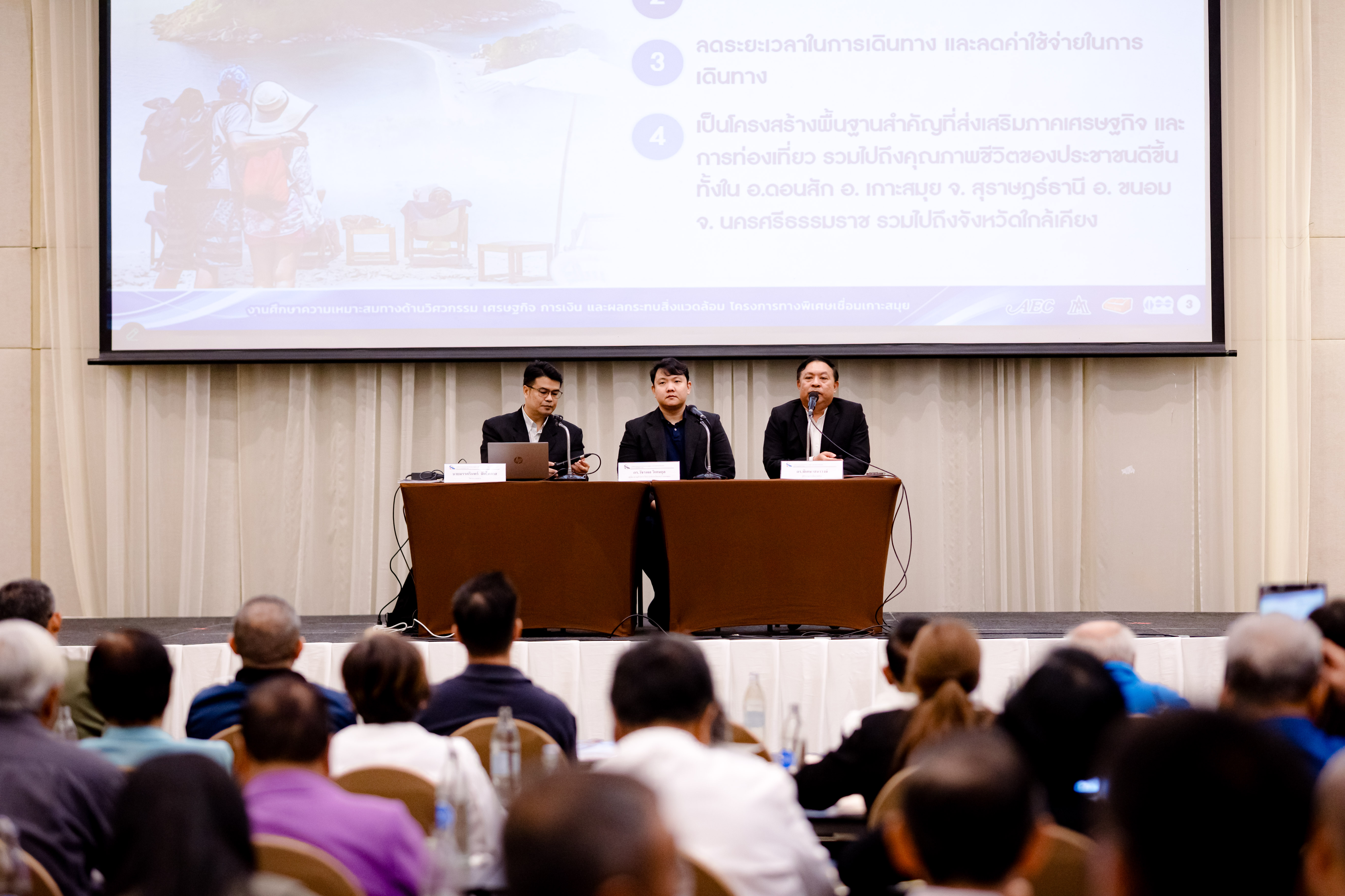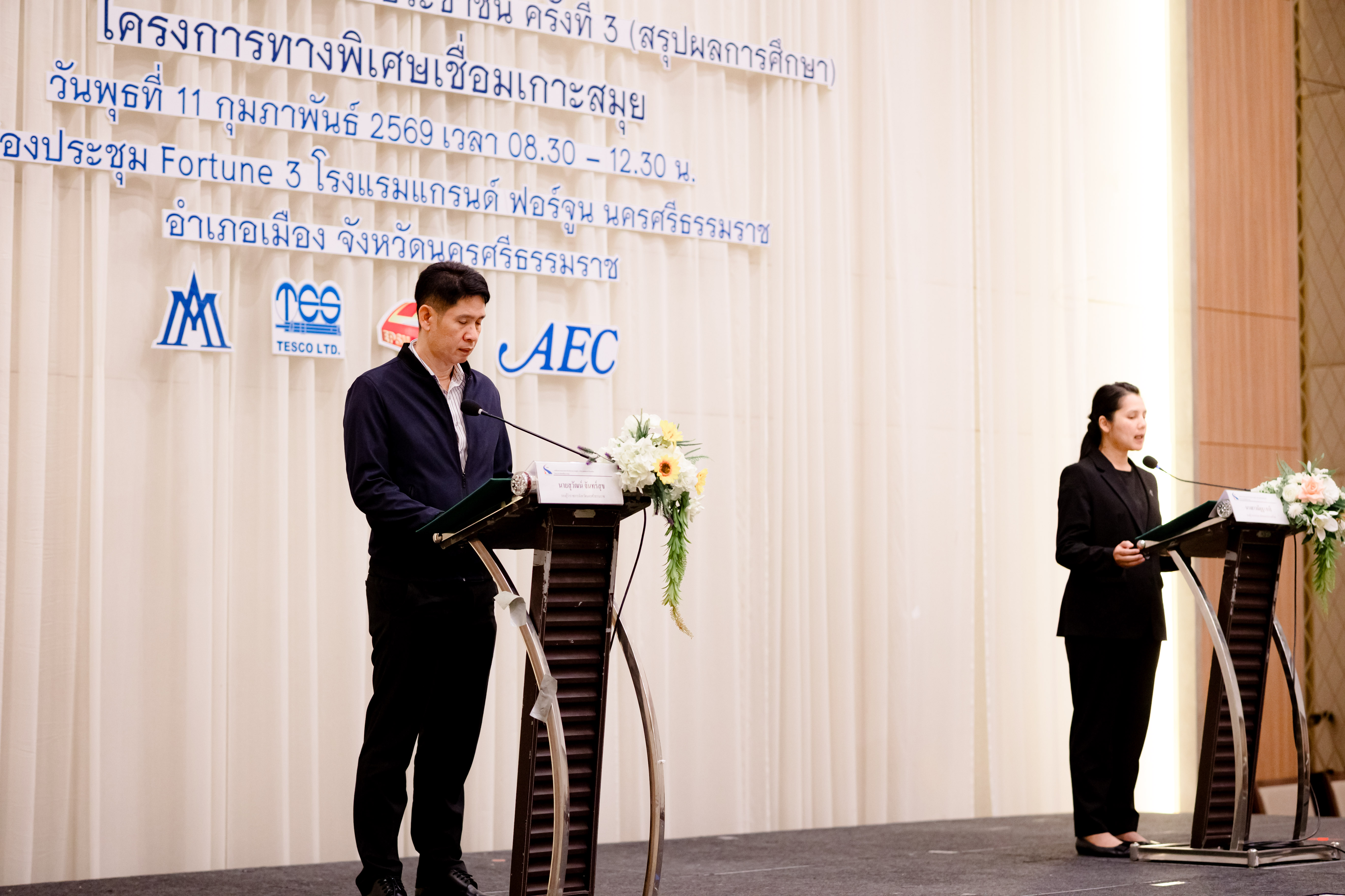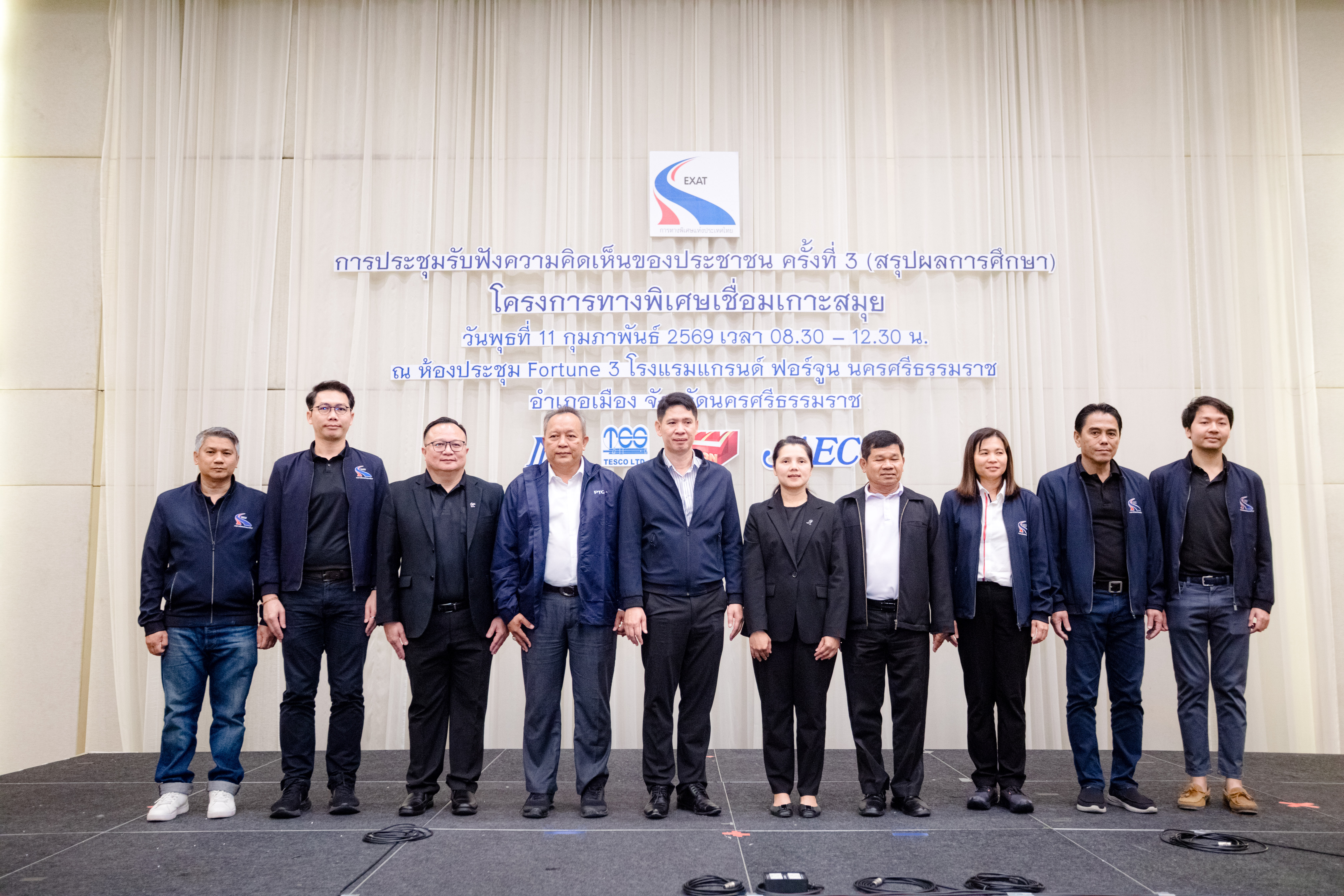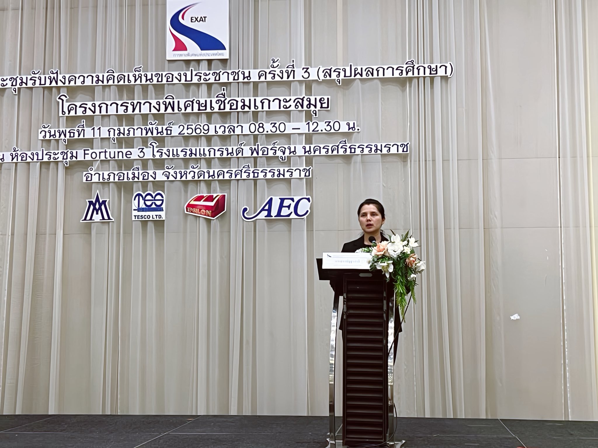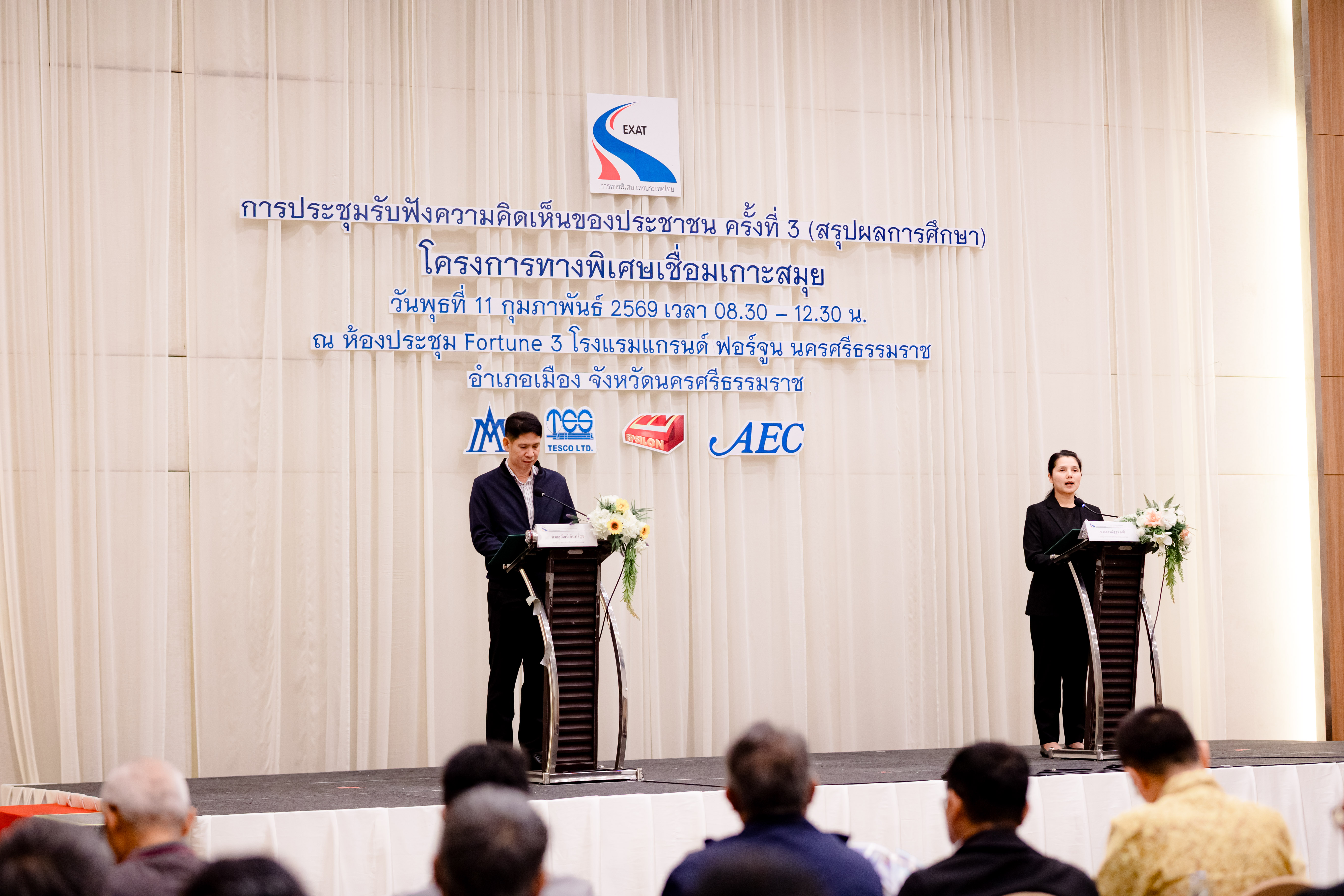 การทางพิเศษแห่งประเทศไทย (กทพ.) กระทรวงคมนาคม จัดการประชุมรับฟังความคิดเห็นของประชาชน ครั้งที่ 3 (สรุปผลการศึกษา) งานศึกษาความเหมาะสมทางด้านวิศวกรรม เศรษฐกิจ การเงิน และผลกระทบสิ่งแวดล้อม โครงการทางพิเศษเชื่อมเกาะสมุย พื้นที่จังหวัดนครศรีธรรมราช เมื่อวันพุธที่ 11 กุมภาพันธ์ 2569 เวลา 08.30-12.30 น. ณ ห้องประชุม Fortune 3 โรงแรมแกรนด์ ฟอร์จูน นครศรีธรรมราช อำเภอเมือง จังหวัดนครศรีธรรมราช โดยมี นางสาวณัฐฐา กาสี รองผู้ว่าการ (การเงิน บัญชี และพัฒนาธุรกิจ) การทางพิเศษแห่งประเทศไทย และ นายสุวัฒน์ จันทร์สุข รองผู้ว่าราชการจังหวัดนครศรีธรรมราช ร่วมเป็นประธานเปิดการประชุมฯ มีผู้เข้าร่วมการประชุมฯ จากหน่วยงานภาครัฐและเอกชน องค์กรปกครองส่วนท้องถิ่น ผู้นำชุมชน องค์กรเอกชน ด้านการคุ้มครองสิ่งแวดล้อมและอนุรักษ์ทรัพยากรธรรมชาติ ครอบคลุมผู้ได้รับผลกระทบ องค์กรพัฒนาเอกชน สถาบันการศึกษา นักวิชาการอิสระ สื่อมวลชน และประชาชนทั่วไปที่ให้ความสนใจ มีผู้เข้าร่วมประชุมทั้งในห้องประชุมฯ และผ่านช่องทางออนไลน์ รวมทั้งหมด 190 คน