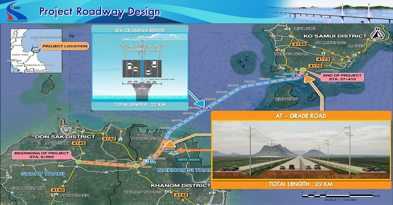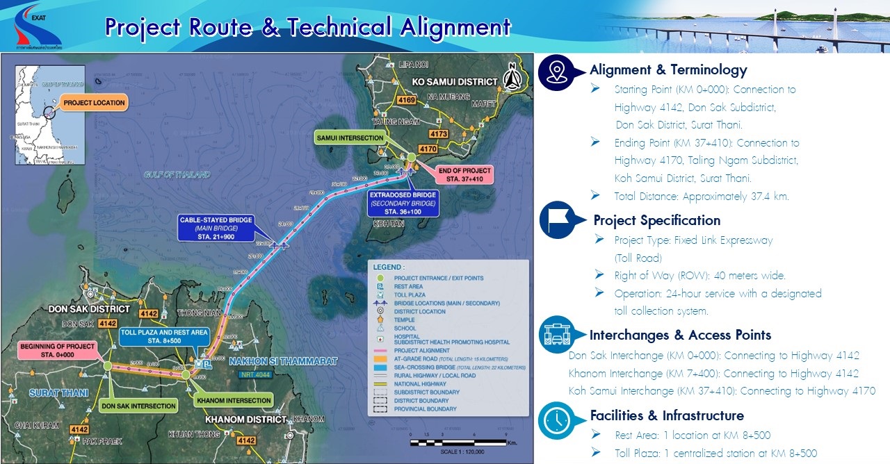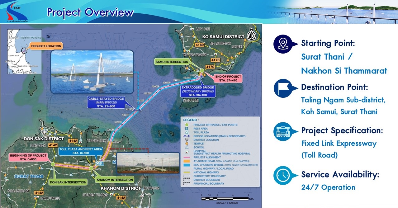 โครงการทางพิเศษเชื่อมเกาะสมุย เป็นทางพิเศษยกระดับข้ามทะเลเชื่อมต่อระหว่างแผ่นดินและเกาะสมุย ขนาด 4 ช่องจราจร (ทิศทางละ 2 ช่องจราจร) มีจุดเริ่มต้นโครงการเชื่อมต่อกับทางหลวงหมายเลข 4142 ในพื้นที่ตำบลดอนสัก อำเภอดอนสัก จังหวัดสุราษฎร์ธานี มุ่งหน้าทางทิศตะวันออกตัดผ่านทางหลวงหมายเลข 4142 ในพื้นที่ตำบลควนทอง อำเภอขนอม จังหวัดนครสรีธรรมราช จากนั้นแนวเส้นทางทุ่งหน้าทางทิศตะวันออกเฉียงเหนือ ผ่านพื้นที่สวนปาล์มและผ่านอ่าวประทับแล้วมุ่งหน้าไปทางทิศตะวันออกเข้าเชื่อมเกาะสมุยบริเวณเนินเขาแหลมสอ และมีจุดสิ้นสุดโครงการเชื่อมต่อกับทางหลวงหมายเลข 4170 ในพื้นที่ตำบลตลิ่งงาม อำเภอเกาะสมุย จังหวัดสุราษฎร์ธานี ระบะทางรวมประมาณ 37.41 กิโลเมตร
